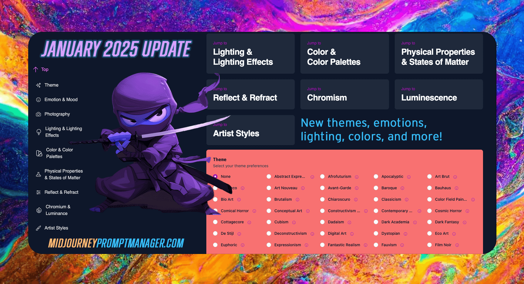 With 144 theme options (up from 119), you have unprecedented control over the foundational aesthetic of your prompts. The new period-specific and cultural themes are particularly valuable for: